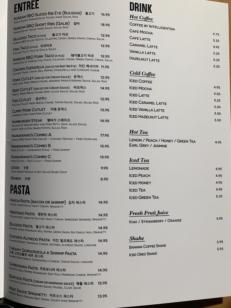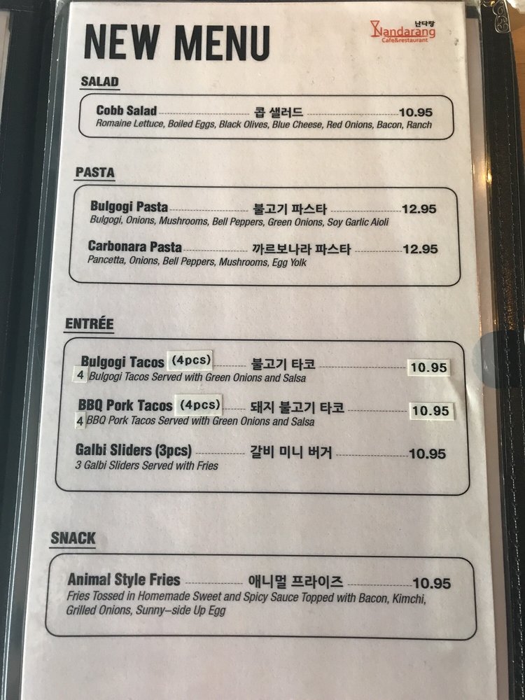 Nandarang Restaurant and Bar, located in Los Angeles, offers a diverse menu with options ranging from appetizers like Animal Style Fries and Fried Dumplings to salads like Asian Chicken Salad and Shrimp Mandarin Salad. Pasta lovers can indulge in Carbonara Pasta, Creamy Gorgonzola Pasta, Creamy Seafood Pasta, and Kimchi Pasta. Customers have praised the delicious dishes, including the Mentaiko Pasta, Bulgogi Fried Rice, and Kimchi Pasta with bacon. The restaurant is known for its welcoming and accommodating atmosphere for solo diners, along with friendly staff and chill vibes. The establishment also offers happy hour specials, free parking, and a tablet-based ordering system. With options like Korean BBQ ribs, udon noodle soup, and a variety of soju flavors, Nandarang impresses with its flavorful and generously portioned meals. Customers enjoy the spacious layout, attentive service, fast food preparation, and crispiness of dishes like fried chicken.